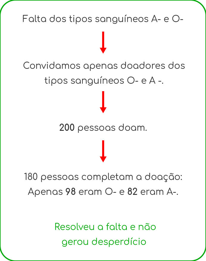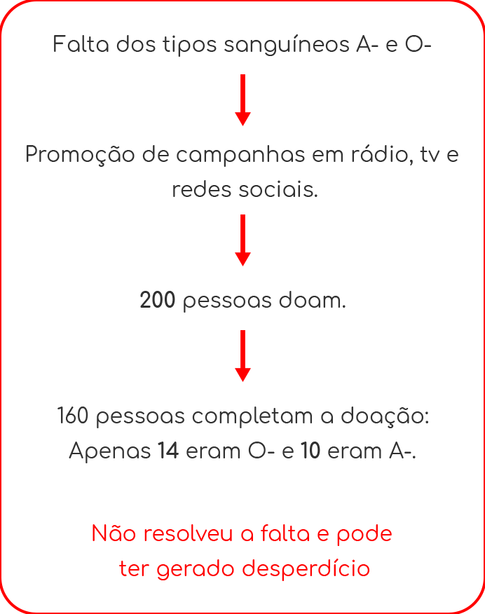 4 – Já em relação a oferta de doadores, as doações normalmente acontecem de forma aleatória em relação a quantidade por tipo sanguíneo, o que faz com que um banco de sangue, mesmo após uma campanha tradicional onde apareçam muitos doadores, possa continuar com a falta de alguns tipos sanguíneos e desperdício de outros.